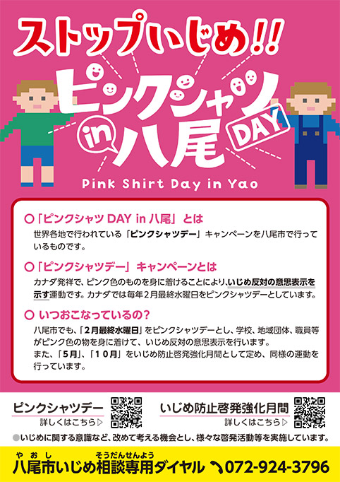 八尾市では、2月、5月、10月を「いじめ防止啓発月間」として、企業や学校などでピンクシャツ運動を実施しています!