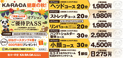 期間中、ご優待価格で利用できるオプション6メニューのうち、4つスタンプがたまると500円割引になります。