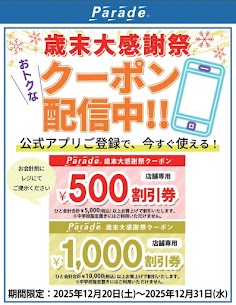 こんにちは!Paradeリノアス八尾店です👟 いよいよ年の瀬ですね。新しい年を迎える準備はお済みですか?「良い靴は、良い場所へ連れて行ってくれる」と言います。 2026年の第一歩を、ピカピカの新しい靴で踏み出しませんか?✨ 今年1年の感謝を込めて、会員様限定の**『歳末大感謝祭クーポン』**をプレゼント! 【クーポン内容】 ✅ 税込 5,000円以上➡ 500円OFF ✅ 税込10,000円以上➡ 1,000円OFF \さらにスゴイ!/すでに値下がりしている**「セール商品」**にも使えます!つまり…**表示価格からさらに【最大1,000円OFF】**になる大チャンスです🉐欲しかったあの靴も、お得にゲットして笑顔で年を越しましょう😊 ●期間 12月20日(土)~大晦日31日(水)までスタッフ一同、年内最後のご来店を心よりお待ちしております! ※ご注意ください※ ・クーポンをご利用になるにはParade会員登録が必要です。・各クーポンお一人様1回限りご利用可能です。・クーポンは利用開始日に自動的に配布されます。・他のクーポンとの併用はできません。