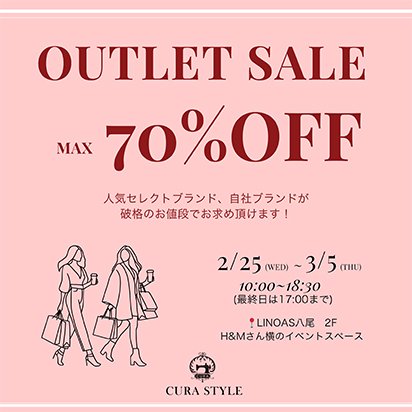 キュアスタイルのOUTLET SALEのお知らせです。人気アパレルブランド商品が、最大70%OFFにてお買い求めいただけます。
